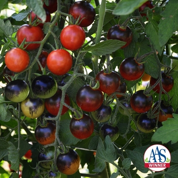 - Red cherry tomatoes with blush of black-purple
