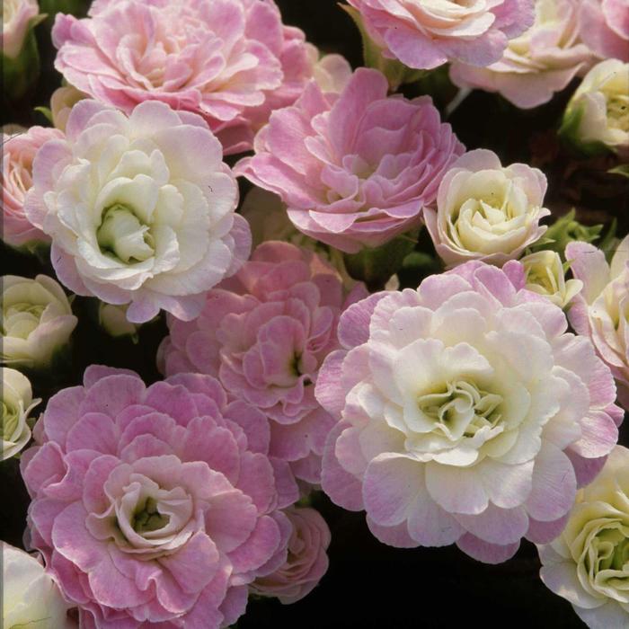 - Pink ruffled, double blossoms
