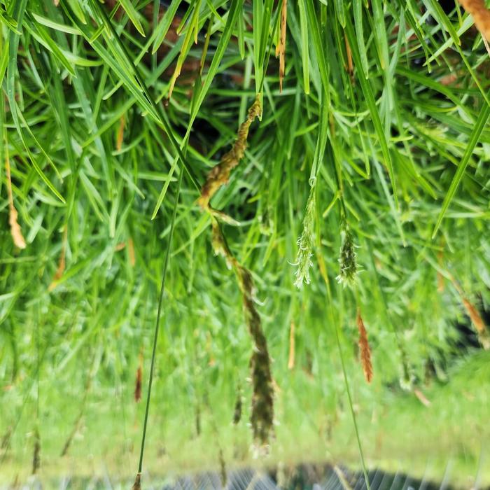 - Small, buff-colored flower spikes
